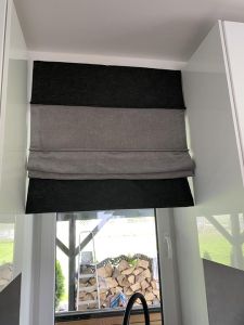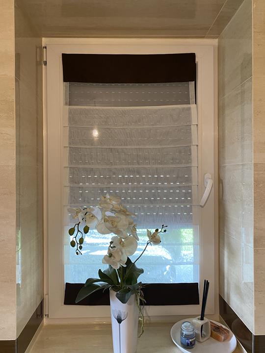 Der Verdunkelungsvorhangstoff sieht in einem anderen Design als dem klassischen toll aus. Hier haben wir ein Raffrollo für das Badezimmer genäht, das effektiv vor Sonnenlicht und den Blicken der Passanten schützt. Dem Blick aus dem Fenster steht jedoch nichts im Wege - Sie müssen nur das Rollo hochziehen. Er wird auf dem Fensterrahmen auf nicht störenden Halterungen montiert und kann zusammen mit dem Fenster geöffnet werden, was die Funktion im Badezimmer erleichtert.