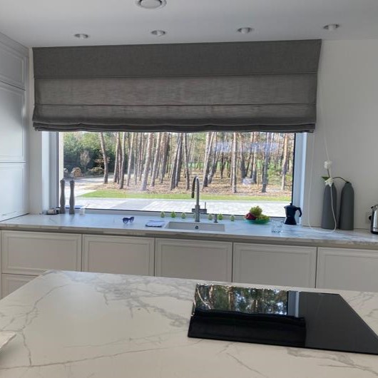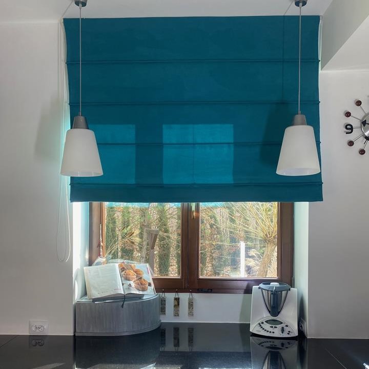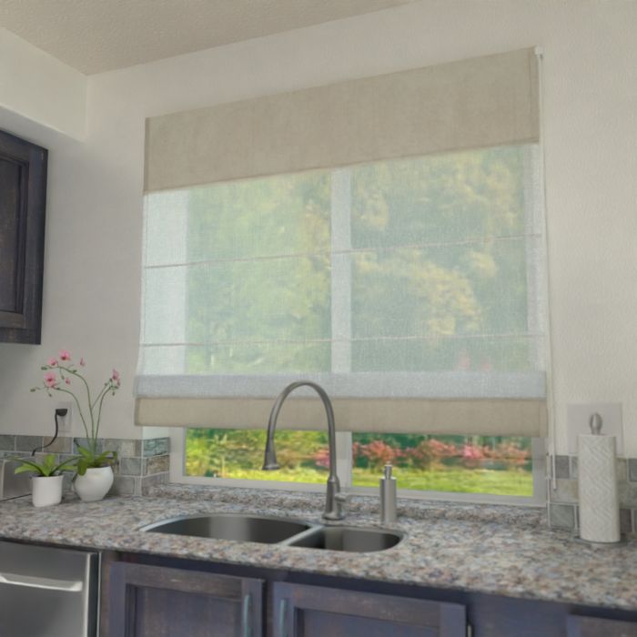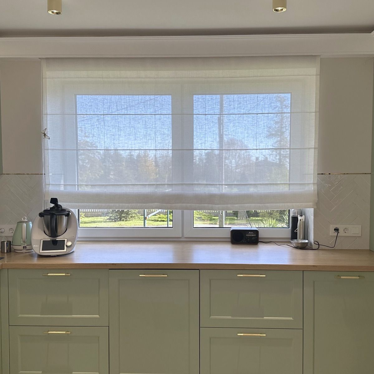 Ein ideales Küchenrollo, das aus zwei Stoffen besteht: einem Vorhangstoff und einem zarten Gardinenstoff.